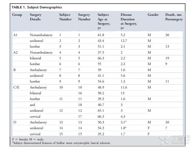 如表一所示,共发生了术后的 7 例死亡。如之前报道的一样第 6 例患者于术后 8 个月时由于先天性心脏病意外死亡,第 3 例术后 13 个月的死亡,是由于疾病进展导致的呼吸衰竭。第 1、5、9、13、14 例的患者,也是因 ALS 疾病进展相关的呼吸系统并发症导致的死亡。