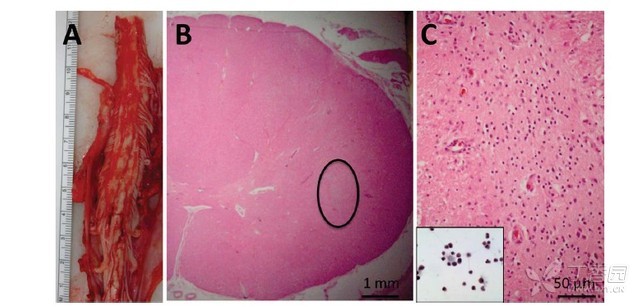尸检后完整的颈椎脊髓图:对移植区域进行连续切片检查,未显示有囊性病变区,出血或明显的组织破坏 (B)HE 染色显示横截面形态完整。有一个细胞巢(圈出部分)并不是脊髓固有的,并且不被胶质细胞或神经元标志物染色 (C)通过更高分辨率显示 B 图中圆圈内细胞的形态,令人回想起移植前干细胞的形态。