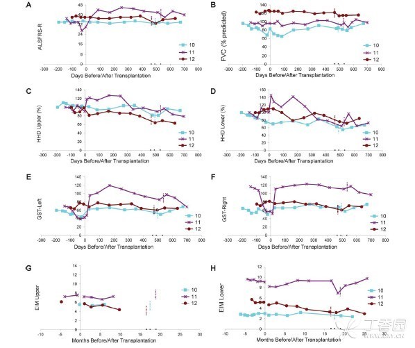 (A)ALSFRS-R--- 萎缩侧索硬化症功能评分量表修订版,(B)FVC--- 用力肺活量, (C,D) HHD--- 手持式肌力测定仪,(E,F)GST--- 握力评估,(G,H)EIM--- 电阻抗肌动描记法。X 轴表示的为术前或术后的时间(手术日 =0)。显示,术后没有任何功能的急速下降。第 14 例,检测数值为 0 的天数为死亡日期。
